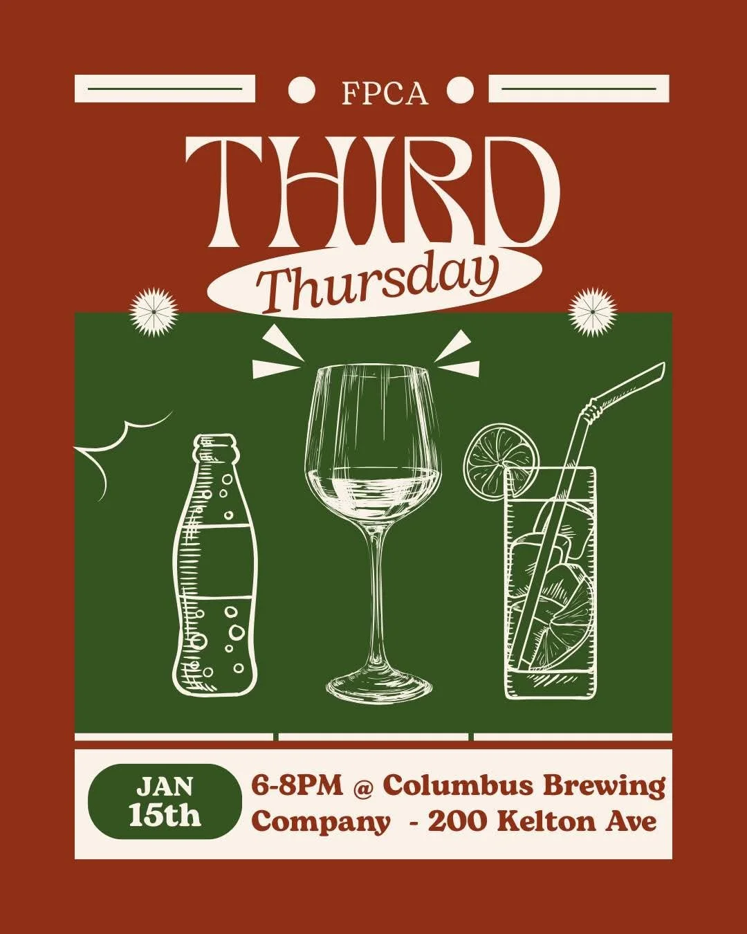 We’ll meet at Columbus Brewing Company - Beer Hall (200 Kelton Avenue). Grab dinner and/or a drink, and come and hang out with your neighbors. You do not need to be an FPCA member to come to Third Thursdays.